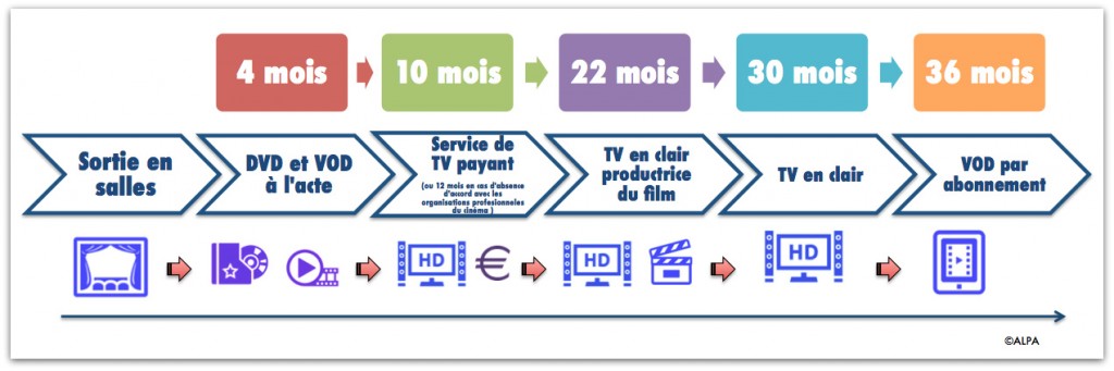 - Exploitation sous forme de vidéogramme: le délai à compter de la date de sortie nationale en salle est de 4 mois pour la première exploitation sous forme de vidéogrammes (DVD, Vidéo à la demande à l’acte).